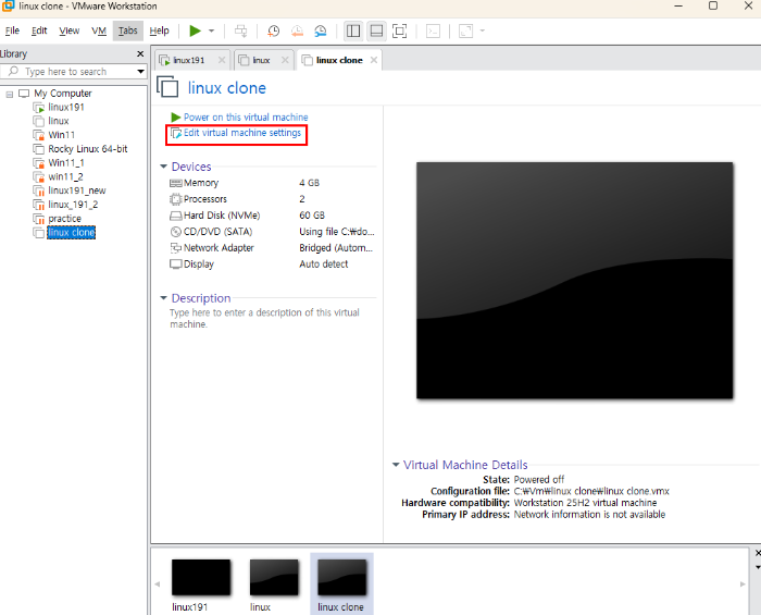 9. 그 다음에 IP 주소를 바꿔야 되기 때문에 만든 클론(linux clone) 아래에 있는 [Power on this virtual machine] 을 클릭 한다