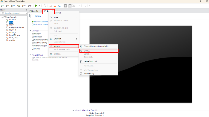 1. 리눅스 제목을 우 클릭 - [Manage] - [Clone] 을 클릭 한다