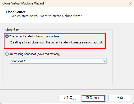3. [The current state in the virtual machine] 을 선택 후 [다음] 을 클릭 한다