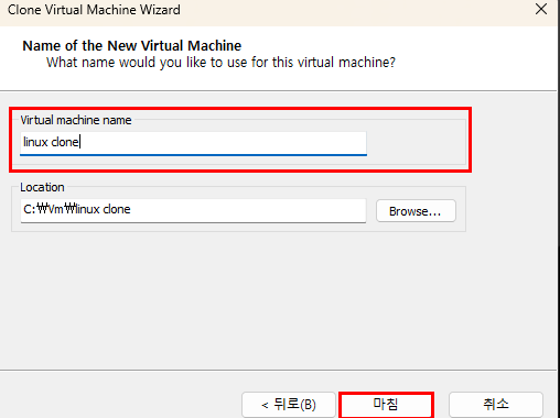 5. [Virtual machine name] 에서 이름을 정한 뒤 [마침]을 클릭 한다