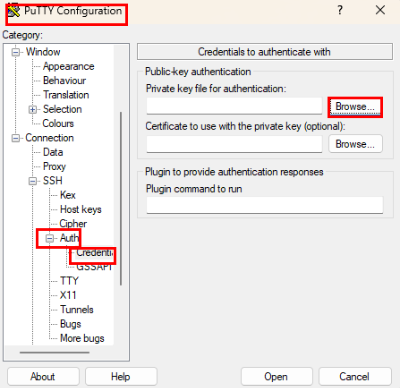 6. Putty 를 다시 시작 - 왼쪽에 Auth - Credentials 클릭 - Browse 클릭 해서 아까 내 컴퓨터에 만들어서 저장한 개인 키 파일을 업로드 한다