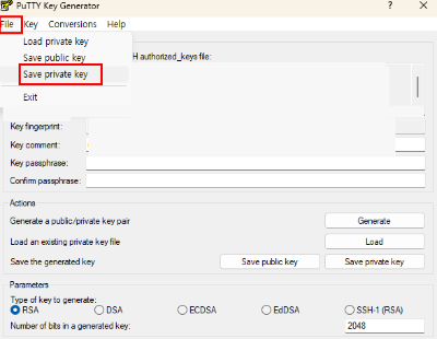 5. 상단에 [File] - [Save private key]를 클릭 해서 개인키를 내 컴퓨터 원하는 위치에 저장 - 알림창은 [Yes] 를 클릭 한다