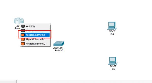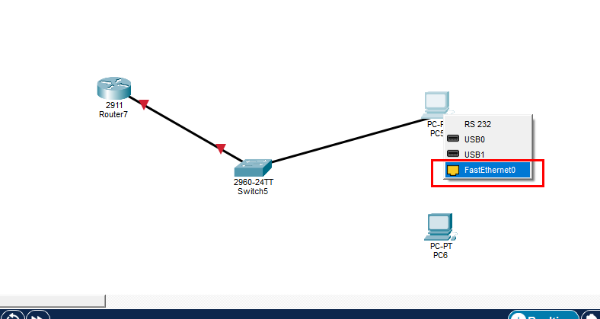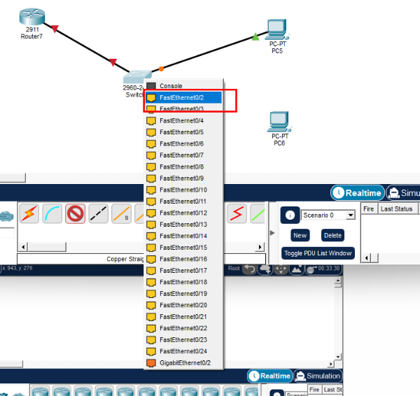 1. 스위치, 라우터, PC 2대 세팅 - 선(검은색) 클릭 하여 인터페이스들 설정