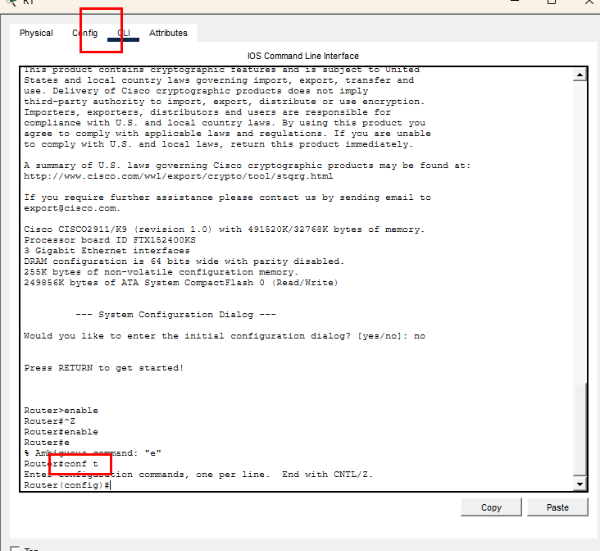 3. 다시 [No] 클릭 - 명령어 enable 을 입력하면 privileged 모드로 바뀐다. conf t 를 명령어로 입력하면 global 모드로 들어간다