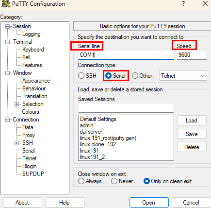 | * Putty 프로그램 접속 - Connection type: Serial line 입력 - Speed 입력 |