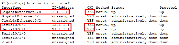 | 1. show ip int brief 각 라우터(R1,R2,R3)의 인터페이스가 정상적으로 살아있는지 확인 한다 그 후 R1에서 Ping 테스트를 한다(ping 12.1.12/Ping 31.1.3/ping1.1.11) - R2,R3 도 동일하게 |