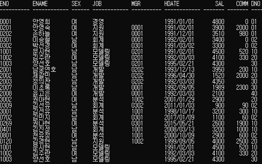 | SQL> ALTER SESSION SET nls_date_format='YYYY/MM/DD'; SQL> DESC emp; SQL> INSERT INTO emp (eno, ename, sex, job, mgr, hdate, sal, comm, dno) 2 VALUES ('1001', '문시현', '남', '모델링', NULL, '1991/02/01', 4500, 520, '10'); SQL> INSERT INTO emp (eno, ename, sex, job, hdate, sal, comm, dno) ---> 아래 2번째에서 mgr 을 안 쓴 상태, 이렇게 쓰면 자동으로 NULL 로 되지만 이렇게 명령어 쓰면 안 된다 2 VALUES ('1002', '김주란', '여', '모델링', '1992/03/03', 4100, 330, '20'); SQL> INSERT INTO emp 2 VALUES ('1003', '양선호', '남', '모델링', NULL, '1995/02/21', 4300, NULL, '30'); SQL> SELECT * FROM emp; SQL> COMMIT; |