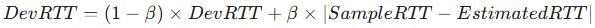 | timeout 설정 EstimatedRTT보다 약간의 여유값을 더한 값으로 설정 DevRTT 네트워크가 얼마나 불안정한지를 나타내는 수치로 실제 측정값(SampleRTT)이 평균(EstimatedRTT) 에서 얼마나 벗어나 있는지 계산한 예측치 공식 * 베타 권장값: 0.25 |