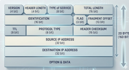 | 인터넷 계층 IP(Internet Protocol) 가장 대표적인 네트워크 계층의 프로토콜, 하위 계층의 서비스를 이요하여 두 노드간의 데이터 전송 경로를 확립해 주는 역할을 한다 IP주소를 총 32비트이며, 네트워크주소와 호스트 주소로 나뉜다 클래스별 차이 ![]() IP 헤더 ![]() * 가로로 4Byte씩 총 20Byte(DESTINATION IP ADDRESS 까지) 1. Version(4bit): IP의 버전 등을 명시함. 인터넷 프로토콜 버전으로 IPv4, Ipv6은 6임. 4비트로 0-15 비트까지 총 16개의 상태를 표현 2. Header Legnth(4bit): IP 프로토콜 헤더의 길이를 나타냄(Word 단위), 헤더의 길이가 가변적일 수 있어 바이트 단위로 계산해 확인 3. Type of Service(8bit): 데이터의 우선순위 등을 설정함. 현재는 거의 무시(사용 안함) 됨 * Type of Service에 값이 있어도 무시함 4. Total Lenghth(16bit): 헤더와 데이터를 합친 전체 패킷(데이터그램)의 길이 5. Identification(16bit): 큰 데이터로 쪼갰을 때(단편화), 원래 같은 데이터였다는 것을 알리기위한 일련번호 * 만약 데이터를 보내는데 데이터가 크다면 큰 데이터가 네트워크를 통과하기 위해 여러 조각(Fragment)로 쪼개진다. 이 조각들이 원래 하나의 데이터였다는 것을 증명하는 일련번호 이다 6. Flag(3bit): 데이터가 쪼개졌는지 여부를 알려줌 - 0 이면 쪼개지지 않은 원본 - 비트 값에 따라 뒤에 남은 조각이 더 있는지 확인함 7. Fragment Offset(13bit): 쪼개진 데이터가 전체의 어느 위치에 해당하는지 알려줌 * 더 쉽게 말해서 내 뒤에 나랑 같은 identification 이 있는지 없는지 알려주게 된다 8. TTL (8bit): 패킷의 '생존 시간'임. 라우터를 거칠 때마다 줄어들며, 0이 되면 패킷을 버려 길을 잃고 영원히 떠도는 것을 방지함 9. Protocol Type (8bit):상위 계층의 프로토콜(TCP, UDP 등) 종류를 알려줌 10. Header Checksum (16bit): 헤더 전달 과정에서 오류(깨짐)가 있는지 검사하며, 손상되었다면 즉시 폐기함 * 깨졌으면 그냥 버림 11. Source IP Address (32bit): 보내는 사람의 IP 주소 12. Destination IP Address (32bit): 받는 사람의 IP 주소 |