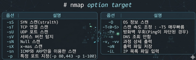 | 네트워크 스캐너이자 보안 감사 도구로 IP 또는 도메인을 대상으로 열려 있는 포트, 서비스, 운영 체제, 버전, 취약점 등을 탐지 할때 사용 # nmap option target |