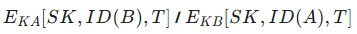 | (1) A의 요청: Request || ID(A), B 클라이언트(A)가 1차 도메인인 KDC에 접속하여 서버(B)와 통신하고 싶다고 요청함 * ID(A) = A의 신원 정보, 1차 로그인을 수행하는 것 (2) KDC의 키 생성 및 전달 1. KDC가 두 주체가 사용할 세션키(SK)를 생성함 2. 전달: A에게 A의 마스터키(KA)로 암호화하여 전달함. 여기서 T(타임스탬프)는 이 요청이 유효한지 구분하는 용도임 B의 마스터키(KB)로 암호화하여 전달함. 여기서 T는 접속하려는 A를 식별하는 용도임 3. 결과 A와 B 모두 동일한 세션키를 안전하게 확보함 (3) A의 신원 확인 A가 KDC로 부터 받은 세션키(SK)로 자신의 신원 (ID(A))과 시간(T)을 암호화하여 서버(B)에 보낸다 (4) B의 응답 B가 세션키(SK)로 응답을 보낸다. 시간(T)에 1을 더해 보냄으로써 서로의 신원을 최종 확인 한다 |