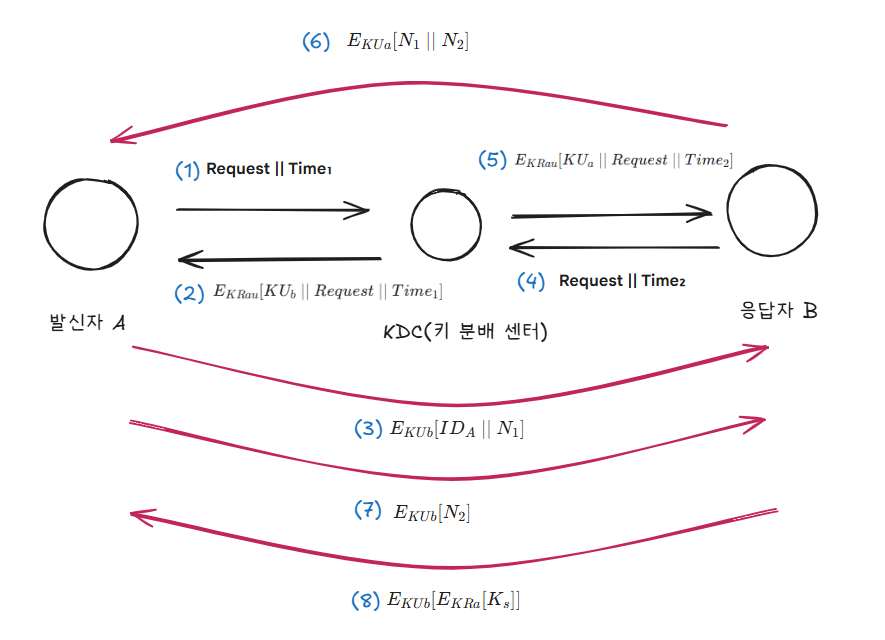 | (1) A의 B에 대한 공개키 요청 A가 KDC에 B의 공개키를 달라고 요청함. 이때 타임스탬프를 함께 보내 이 요청이 방금 만들어진 요청임을 증명함 (2) A가 B의 공개키 확보 KDC는 B의 공개키(KUb) 와 A의 요청 메시지를 자신의 개인키(KRau)로 암호화해서 보낸다 (3) A의 첫 번째 신원 확인 시도 A는 전달받은 B의 공개키를 저장하고, 자신의 이름(IDA)과 확인용 난수 숫자(N1) 를 B의 공개키로 암호화해서 B에서 보낸다 (4) B에게 A의 공개키 요청 B가 공개키 기관에 A의 공개키를 달라고 요청한다 (5) B의 A의 공개키 획득 기관이 자신의 개인키(KRau)로 A의 공개키(KUa)를 암호화해서 B에게 준다 상호 신원 인증 완료 (6) B가 A의 공개키(KUa)로 A의 질문(N1)에 답하고, 자신의 질문(N2)을 담아 보내는 단계 이다 (7) A가 B의 공개키(KUb)로 B의 질문(N2)에 답하며 인증을 마무리 한다 (8) 세션 키 분배 및 통신 A가 세션 키(Ks)를 자신의 개인키(KRa) 로 서명하고, 다시 B의 공개키(KBb) 로 암호화해서 보내는 최종 단계 이다 |