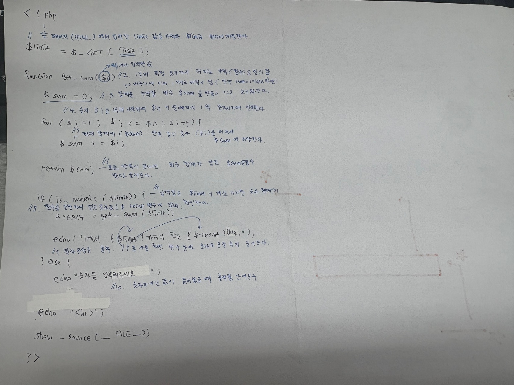 | 사용자로부터 숫자(n)를 입력받아, 1부터 그 숫자까지의 모든 정수를 더한 합계(sum)를 구하는 프로그램을 작성하는 실습 <?php // 1. 앞 페이지(HTML)에서 입력한 'limit' 값을 가져와 $limit 변수에 저장한다 $limit = $_GET['limit']; // 2. 1부터 특정 숫자까지 더하는 규칙(함수)을 정의한다. $n은 전달받을 숫자가 들어갈 자리이다 function get_sum($n) { // 3. 합계를 누적할 변수 $sum을 만들고 0으로 초기화한다 $sum = 0; // 4. 숫자 $i를 1부터 시작하여 $n이 될 때까지 1씩 증가시키며 반복한다 *1부터 그 숫자까지의 모든 정수이므로 $i=1부터 시작함 for ($i = 1; $i <= $n; $i++) { - * $i <= $n;인 이유는 만약 1부터 10까지의 숫자를 더하는데 $i < $n; 이거라면 $i <10 이라면 $i가 9일 때는 참이라서 9를 더한다. 그 다음 $i가 10이 되면 10 < 10 이되어 거짓(false)가 된다. 10은 더 하지 못하고 9까지만 더한 채 반복분이 끝나게 된다 // 5. 현재 합계($sum)에 반복 중인 숫자($i)를 더하여 다시 $sum에 저장한다 $sum += $i; } // 6. 모든 반복이 끝나면 최종 합계가 담긴 $sum을 함수 밖으로 돌려준다 return $sum; } // 7. 입력받은 $limit이 계산 가능한 '숫자' 형태인지 확인한다 if (is_numeric($limit)) { // 8. 함수를 실행하여 얻은 결과값을 $result 변수에 담는다 $result = get_sum($limit); // 9. 결과 문장을 출력한다. {}를 사용하면 변수 안의 숫자가 문장 속에 바로 들어간다 echo("1에서 {$limit}까지의 합은 {$result}입니다."); } else { // 10. 숫자가 아닌 값이 들어왔을 때 출력할 안내 문구이다 echo "숫자를 입력해주세요."; } echo "<hr>"; // 11. 현재 작성된 이 파일의 전체 코드를 화면에 그대로 보여준다 show_source(__FILE__); ?> |