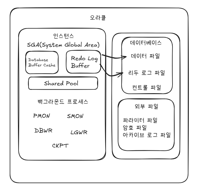 | ⚠️ 유저 프로세스 & 서버 프로세스 유저 프로세스가 활성화되어 있을 때 서버 프로세스가 활성화 된다 1. 오라클의 기본 구성 ★★★ 오라클은 인스턴스와 데이터베이스로 구성된다 - 인스턴스(=메모리, 1차 메모리): 컴퓨터를 켜야 존재하는 영역 - 데이터베이스(=디스크, 2차 메모리): 컴퓨터를 꺼도 남아있는 영구 저장소 컴퓨터를 끄면 디스크만 남는다. 컴퓨터를 켜면 유저 프로세스가 활성화되는 것이다. 데이터는 데이터베이스에 저장 된다 2. 데이터베이스의 구성 ★★★ 데이터베이스는 세 가지 파일로 구성된다 - 데이터 파일: 실제 데이터가 저장 되는 곳 - 리두 로그 파일: 작업 복구에 사용(미러링 필수) - 컨트롤 파일: 데이터베이스 구조 정보 저장(먼저 읽힘) * 파일의 이름이 뭔지, 현재 상태가 어떤지 등 물리적인 정보가 들어있음 3. 인스턴스의 구성 ★★★ 인스턴스는 SGA는 메모리와 PMON(피몬), SMON(에스몬), DBWR(디비롸이터), LGWR(로고롸이터), CKPT(체크포인트) ( (=백그라운드 프로세서 )으로 구성된다 1) SGA(System Glabal Area) (1) Database Buffer Cache - 우리가 실제 작업 하는 메모리 공간으로 INSERT, UPDATE, DELETE 등 작업(트랜잭션) 은 여기서 수행된다 SQL 1. 문장 유효성 검사 (* 문장이 비정상이면 실행 안하게 됨) 2. 실행 계획 세움 (* 실행 계획 세운 것을 라이브러리 캐쉬에 저장함) 3. 실행: 버퍼 캐시에 데이터가 있으면 바로 작업, 없으면 디스크에서 읽어와 버퍼 캐시에 올린 후 작업 * commit; 할때가 아니라 insert 할때 데이터가 사용 된다 (2) Redo Log Buffer(작업일지) - INSERT, UPDATE, DELETE 등 트랜잭션을 시간 순서대로 기록함 - 데이터를 저장하는게 아니라 "무슨 작업을 했는지"를 기록하는 것 - redo log 파일이 손상되지 않는 한 데이터베이스의 데이터는 손상되지 않는다(*손상 되지 않기 위해 미러링 실시) * 미러링: 완전히 같은 파일을 2개 가지고 있는 것 - 데이터를 복구할 때 사용한다 - LGWR이 이 내용을 리두 로그 파일로 써준다 2) 백그라운드 프로세스 (1) PMON(피몬): 프로세스 모니터 - 비정상 종료된 프로세스 정리 (2) SMON(에스몬): 시스템 모니터 - 인스턴스 복구 (3) DBWR(디비롸이터): Database Buffer Cache -> 데이터 파일로 기록 ★ (4) LGWR(로그롸이터): Redo Log Buffer -> 리두 로그 파일로 기록 (5) CKPT(체크포인트): 동기화 시점 기록, DBWR 작동 신호 전달 * 동기화 시점이 다르면 데이터베이스가 불안정한 상태라고 생각을 하게 됨. 그래서 동기화 시점을 기록해줌 ⚠️이 5개 중 1개라도 죽으면 나머지도 전부 죽는다. 절대 건드리면 안 됨 DBWR이 핵심인 이유: 데이터베이스(디스크)가 바뀌면 극적으로 바뀌는 애가 DBWR 이다. DBWR은 Database Buffer Cache를 긁어다가 데이터 파일에 전달해준다 4. 외부 파일 3종 1) 파라미터(매개변수) 파일: 파라미터 파일은 없앨 수 없음. 인스턴스를 띄우기 위한 여러 설정 값들이 파라미터 파일에 들어 있다 * 이름과 위치는 마음대로 바꾸면 안됨 * 과거: p파일(텍스트파일) -> 현재: sp파일(바이너리파일) / 2개 파일이 있는 것임 * 바이너리 파일: 0과 1로만 이루어진 파일. 사람이 그냥 열어서 읽을 수 없고, 프로그램이 일겅야 해석 가능한 파일 * SP 파일은 P파일을 컴파일해서 만든다(반대도 가능) * 파라미터 파일에서 p파일과 sp파일이 있다면 sp 파일을 사용함 2) 패스워드 파일: 관리자 인증에 사용 * 오라클 관리 계정인 sys와 system 이 있음. sys가 같은 컴퓨터가 아니라 외부 컴퓨터에서 접속 할때 패스워드가 필요함 3) 아카이브 로그 파일: 리두 로그 파일을 바깥에 복사한 것 * 아카이브 로그 파일이 없으면 -> No Archive Log Mode * 아카이브 로그 파일이 있으면 -> Archive Log Mode ⚠️ 약자 표기 주의 SGA: 약자는 한글로 쓰면 안됨 컨트롤 파일, 리두로그파일: 한글로 써도 됨 |