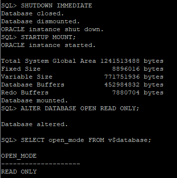 | > STARUP OPEN READ ONLY; - 종료 상태의 DB를 읽기전용으로 OPEN 함 > ALTER DATABASE OEPN READ ONLY; - MOUNT 상태의 DB를 일긱 전용으로 OPEN 함 > SELECT OPEN_MODE FROM V$DATABASE; - READ ONLY와 READ WRITE 상태가 있음 |