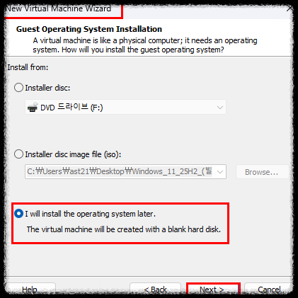 3) New Virtual Machine Wizard 화면에서 [I will install the operating system later] 을 클릭 한다