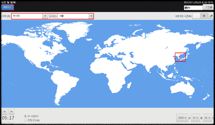 15) [시간과 날짜]를 클릭 - 마우스로 한국 한반도를 점을 찍으면 자연스럽게 도시가 선택이 된다