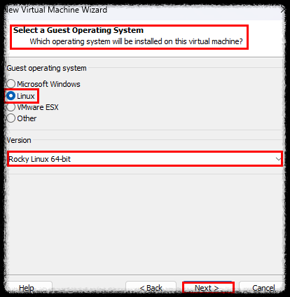 4) Select a Guest Operating System 화면에서 "Guest operating system" 은 [Linux] 로 선택 하고, "Version"은 [Rocky Linux 64-bit] 로 선택 한다. [Next]를 클릭 한다