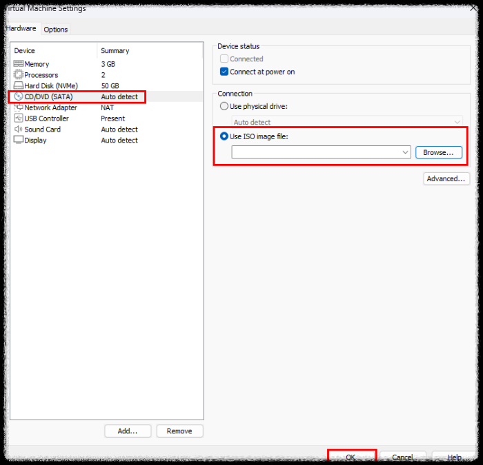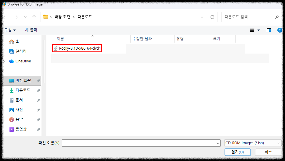 11) 왼쪽에 CD/DVD(SATA) 를 클릭 - Connection 부분에서 [Use ISO image file] 옆에 Browse...를 클릭해서 미리 다운로드 받아놓은 Rocky 파일을 넣는다