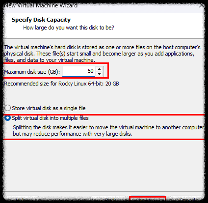 6) 가상 머신의 디스크 사이즈를 대략 50GB로 잡고, 밑에 체크하는 부분은 그대로 Skip 한 채 [Next]를 클릭 한다