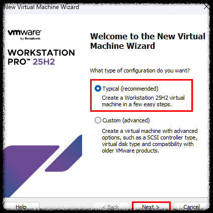 2) New Virtual Machine Wizard 화면에서 [Typical] 선택 후 [Next] 을 클릭 한다