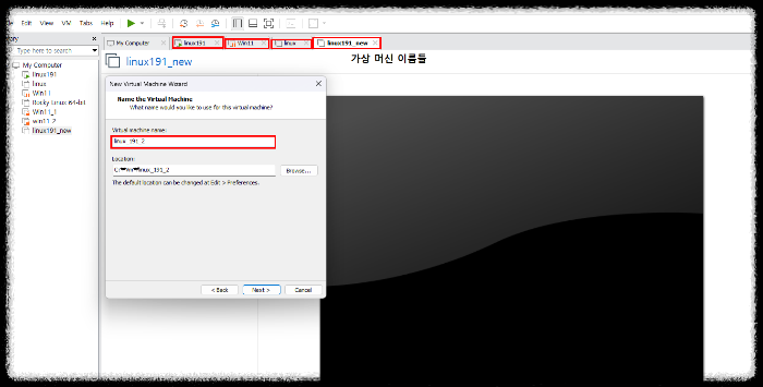 5) Virtual machine name 에서 가상머신 이름을 정해준다. linux_191_2 로 입력 후 [Next]를 클릭 한다