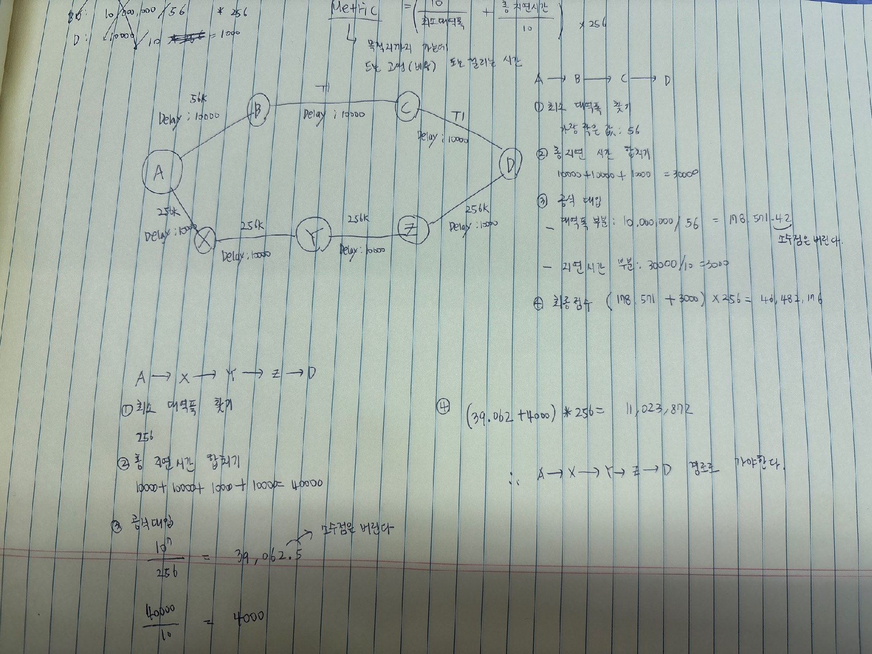 | - IGRP 메트릭과 동일한 개념 - 더 세부적인 표현을 위해 IGRP 메트릭에 256을 곱해서 표현 (메트릭 간의 값을 크게 보이게 하기 위해 256을 곱함) - Bandwidth(대역폭) 를 계산할 때는 "전체 경로 중 가장 대역폭이 낮은(좁은) 구간의 값"을 기준으로 삼는다 * 라인의 속도가 커질수록 계산된 Bandwidth 값은 점점 줄어든다 - k2,k4,k5는 다 0으로 계산됨 |