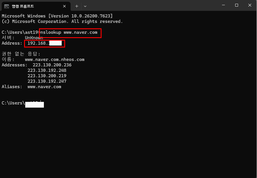 ![]() 1. CMD 접속 nslookup www.naver.com 입력 2. 각 용어 해설 서버: unknown - 이 서버가 윈도우 서버인지 어떤 서버인지 모른다는 뜻 Address: 192.168.10.11 - www.naver.com 의 IP가 뭡니까를 192.168.10.11 한테 물어봤다는 뜻 이름: www.naver.comnheos.com (도메인 레벨이 5개가 된다 www/naver/com/nheos/com) - 이름이 이 주소 라는 뜻 Addresses 의 주소들이 너무 길어서 밑에 Aliases 라는 별명을 쓰게 되는 것이다 - 이 별명을 쓰게 되면 4개 주소(223.138. ...) 에서 1개 주소만 쓰면 됨 (내 컴퓨터가 네이버 서버 4대 중(223.138.192.248 등) 아무나 한 놈 걸려라 하고 그 중 하나의 IP 주소를 골라 잡아서 성공적으로 네이버 사이트에 접속한다 |