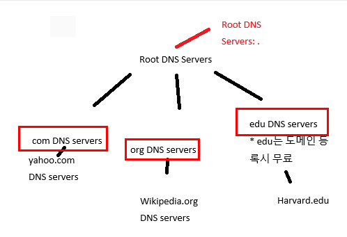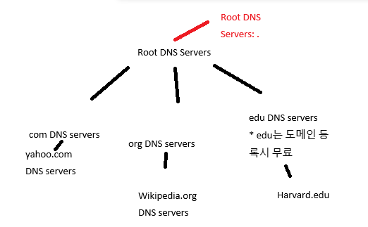 | 1) 도메인은 오른쪽에서 왼쪽으로 갈수록 하위 계층으로 내려가는 트리(Tree) 구조이다. 2) .(Root): 모든 도메인의 뿌리이며 가장 오른쪽에 생략되어 있음 (예. www.naver.com.) ex) www.naver.com www/naver/com 을 각각 관리하는 컴퓨터가 따로 있음 - www(Host Name, 접속하고자 하는 컴퓨터이름: 해당 조직 내에서 실제로 서비스를 제공하는 특정 컴퓨터(서버)의 이름) - naver: 조직의 이름 - com: 조직의 분류, 국가를 나타내는 최상위 도메인 * http://www.naver.com ex) com에 가면 naver의 IP를 알 수 있고, naver에 가면 www의 IP를 알 수 있다 => 이걸 알면 nameserver(=dndserver)를 알 수 있다 |