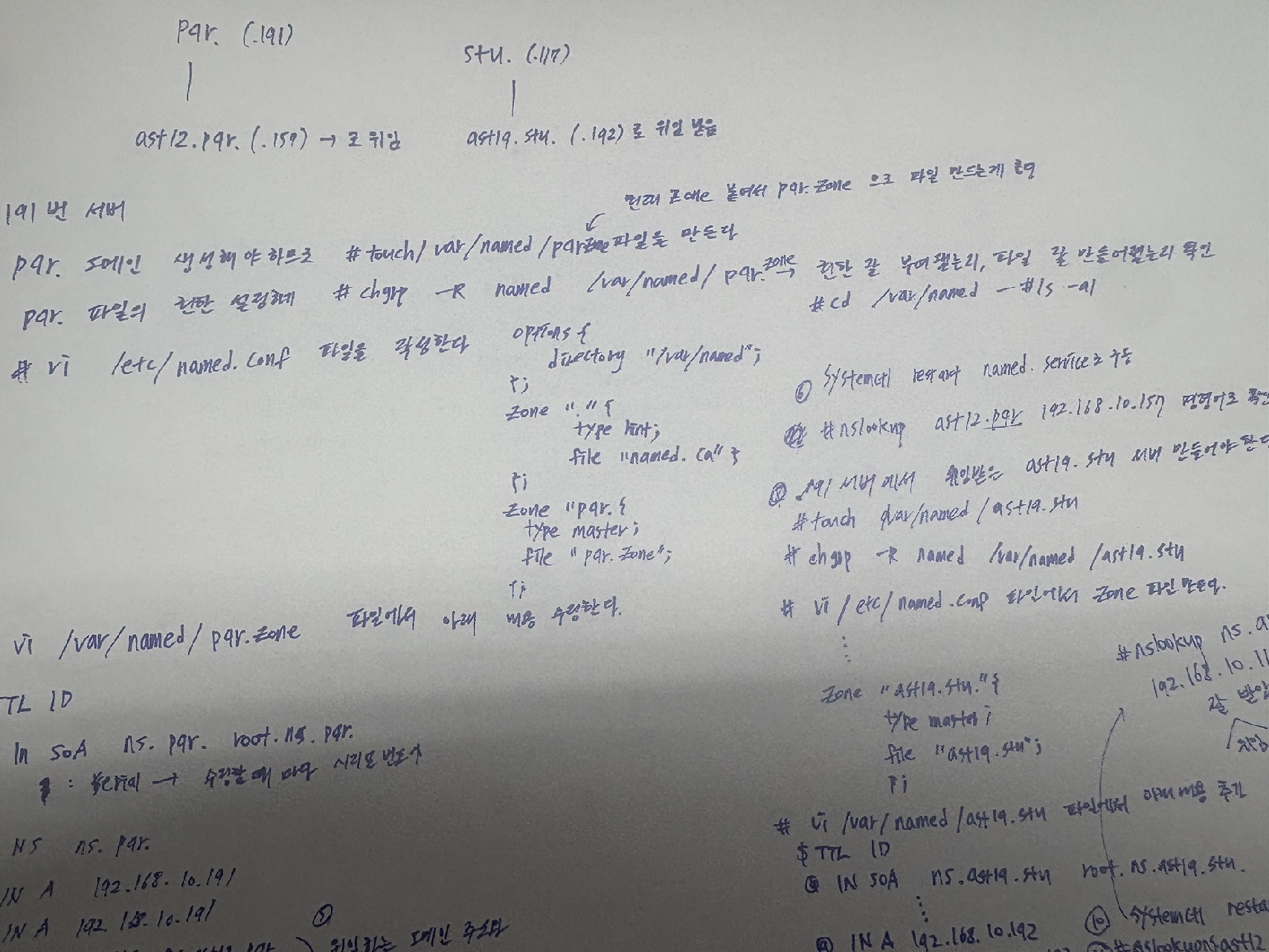 | 1. 2개 파일 다운로드 ,호스트명 정하기 2. root.zone 파일을 만든다 # touch /var/named/root.zone * 읽기전용 파일이라 권한설정 안해도 됨 2. # vi /etc/named.conf 파일에 아래내용을 넣는다 options { directory "/var/named"; }; zone "." { type master; file "root.zone"; }; 2. # vi /var/named/root.zone 에서 내용 넣기 ㅡㅡㅡㅡㅡㅡㅡㅡㅡㅡㅡㅡㅡㅡㅡㅡㅡㅡㅡㅡ $TTL 1D @ IN SOA ns. root.ns. ( 1 ; Serial 1D ; Refresh 1H ; Retry 1W ; Expire 3H ) ; Minimum IN NS ns. @ IN A ns. ns IN A 192.168.11.191 www IN A 192.168.11.191 sec. IN A ns.sec. ns.sec IN A 192.168.11.192 ㅡㅡㅡㅡㅡㅡㅡㅡㅡㅡㅡㅡㅡㅡㅡㅡㅡㅡㅡㅡㅡ * 그리고 나서 밑에 itc 도메인도 추가 하면 된다 (ns.sec 밑에) 3. # systemctl start named 4. # nslookup ns.sec 192.168.11.191 자기 한테 물어봐 5. 근데 문제는 여기 하위에 있는 각 서버들의 #vi/ var/named/named.ca 파일을 바꿔야한다 작업의 목적: 인터넷 표준 루트 서버 목록을 삭제하고, 191번을 최상위(Root)로 인식시켜 우리만의 닫힌 DNS 체계를 가동하기 위함이다 * 결과: 이 설정이 없으면 하위 서버들은 191번이 루트 서버인 줄 모르기 때문에 사설 도메인(ast.sec)을 절대 찾을 수 없다 192번 에서 # vi/ var/named/named.ca 두줄 남기고 내용 다 삭제 ㅡㅡㅡㅡㅡㅡㅡㅡㅡㅡㅡㅡㅡㅡㅡㅡㅡㅡㅡㅡㅡㅡㅡㅡㅡㅡㅡㅡ ㅡㅡㅡㅡㅡㅡㅡㅡㅡㅡㅡㅡㅡㅡㅡㅡㅡ 193번 에서 # vi/ var/named/named.ca 두줄 남기고 내용 다 삭제 ㅡㅡㅡㅡㅡㅡㅡㅡㅡㅡㅡㅡㅡㅡㅡㅡㅡㅡㅡㅡㅡㅡㅡㅡㅡㅡㅡㅡ ;; ANSWER SECTION: . 518400 IN NS a.root-servers.net. ;; ADDITIONAL SECTION: a.root-servers.net. 518400 IN A 192.168.11.191 ㅡㅡㅡㅡㅡㅡㅡㅡㅡㅡㅡㅡㅡㅡㅡㅡㅡㅡㅡㅡㅡㅡㅡㅡㅡㅡㅡㅡㅡ 194번 에서(캐쉬 서버) ㅡㅡㅡㅡㅡㅡㅡㅡㅡㅡㅡㅡㅡㅡㅡㅡㅡㅡㅡㅡㅡㅡㅡㅡㅡㅡㅡㅡ ;; ANSWER SECTION: . 518400 IN NS a.root-servers.net. ;; ADDITIONAL SECTION: a.root-servers.net. 518400 IN A 192.168.11.191 ㅡㅡㅡㅡㅡㅡㅡㅡㅡㅡㅡㅡㅡㅡㅡㅡㅡㅡㅡㅡㅡㅡㅡㅡㅡㅡㅡㅡ 루트 서버(191번)에 설정하는 이유 * 역할: 전체 시스템의 뿌리이다 * 이유: 자신이 "루트"라는 것을 선언해야 한다. 모든 도메인 탐색은 여기서부터 시작된다. 191번이 .sec 서버(192번)가 어디 있는지 모르면 하위 도메인을 찾을 수 없다 캐시 서버(194번)에 설정하는 이유 * 역할: 사용자의 질문을 대신 받아 발로 뛰는 대행자이다 * 이유: 캐시 서버는 처음에 아무 정보가 없다. 도메인 주소를 찾으려면 **"어느 문을 먼저 두드려야 하는지(시작점)"**를 알아야 한다 * 194번의 named.ca에 191번 주소를 넣는 것은 **"모르는 게 생기면 무조건 191번(우리 루트)한테 가서 물어봐"**라고 시작 지점을 지정해 주는 것 6. # systemctl restart named로 서버 구동하기 7. 캐시 서버에서 # nslookup ns.ast.sec 192.168.11.194 --- 자신한테 물어보고 성공하면 됨 |